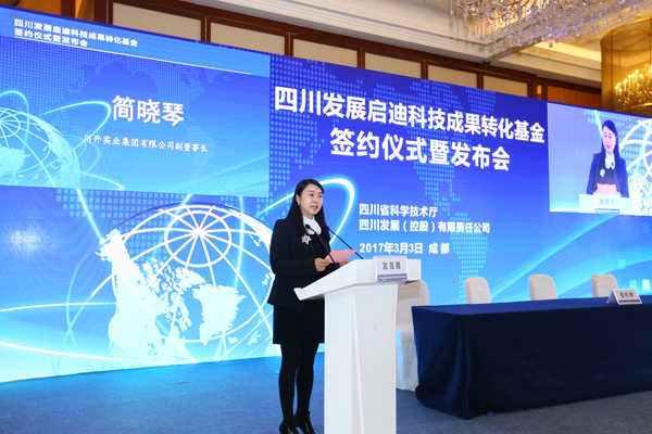 2017年3月3日,由川開(kāi)集團(tuán)與啟迪控股股份有限公司(以下簡(jiǎn)稱“啟迪控股”)、四川發(fā)展(控股)有限責(zé)任公司(以下簡(jiǎn)稱“川發(fā)展”)共同發(fā)起設(shè)立的“四川發(fā)展啟迪科技成果轉(zhuǎn)化基金”簽約儀式暨發(fā)布會(huì)在成都世紀(jì)城天堂洲際酒店隆重舉行,四川省科學(xué)技術(shù)廳副廳長(zhǎng)楊品華主持本次簽約儀式。