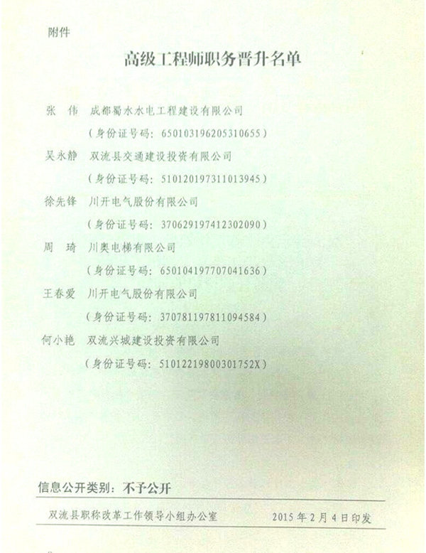 2015年2月4日,雙流縣職稱改革工作領(lǐng)導(dǎo)小組辦公室宣布了“雙流縣職稱改革領(lǐng)導(dǎo)小組辦公室關(guān)于同意張偉等6人高級工程師職務(wù)任職資格的通知”,其中一半人員為川開集團(tuán)員工,分別為徐先鋒(川開電氣股份)、周琦(川奧電梯)、王春愛(川開電氣股份),熱烈祝賀川開集團(tuán)以上員工順利取得高級工程師任職資格,并希望集團(tuán)全體員工向徐先鋒等三位同志學(xué)習(xí),在新的一年里以更輝煌的成績譜寫川開新的篇章,為自己的未來譜寫華麗篇章。