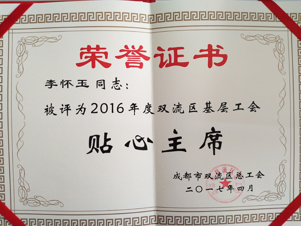 過去一年,集團工會在維護職工合法權益、構建和諧勞動關系、促進公司的生產經營方面做了大量的工作,受到上級工會的充分肯定,工會主席李懷玉同志被評為2016年度雙流區(qū)基層工會“貼心主席”。